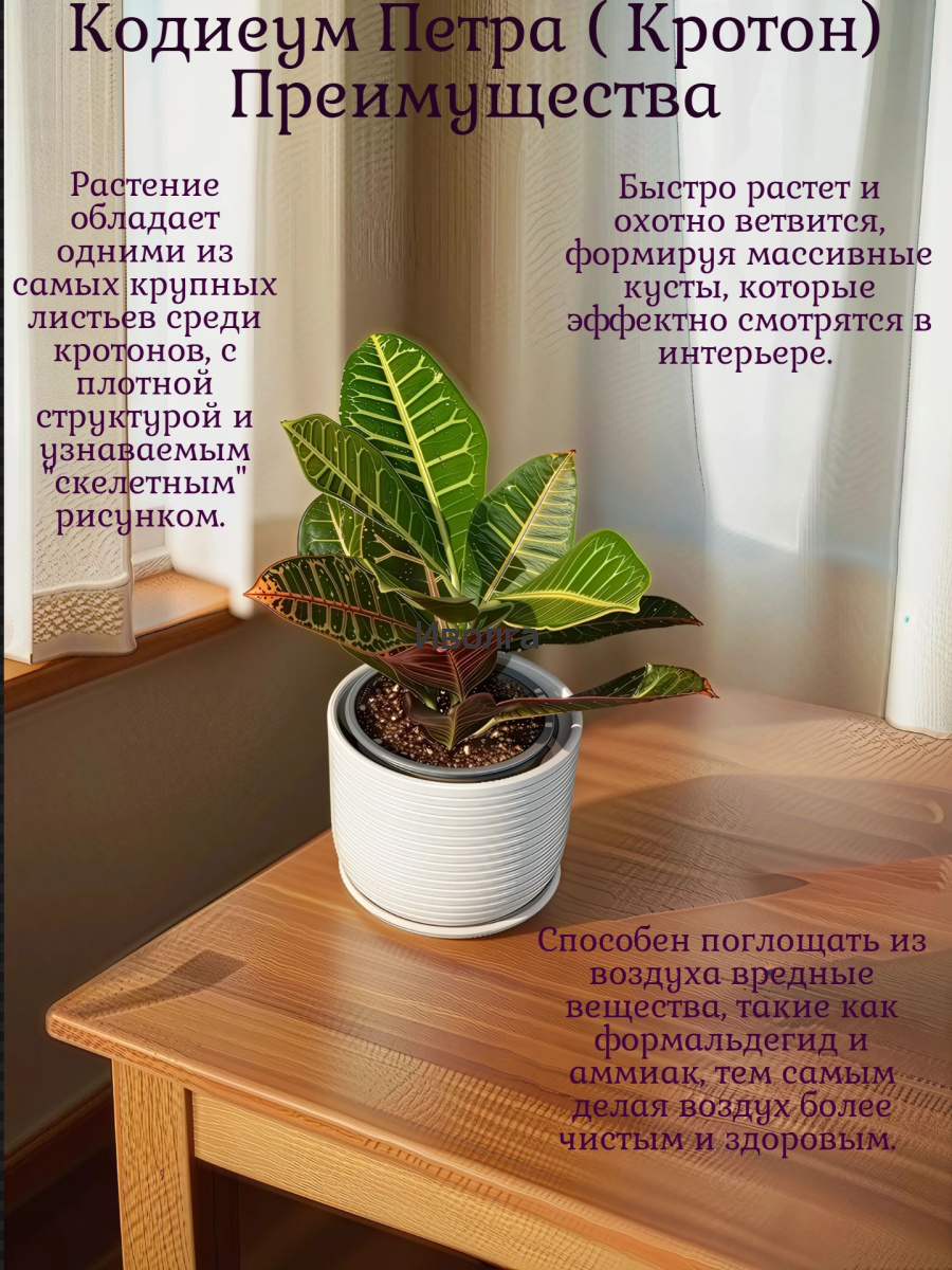 Кодиеум «Петра» достаточно быстро растет и охотно ветвится, что позволяет ему даже в солидном возрасте выглядеть пышно и интересно.