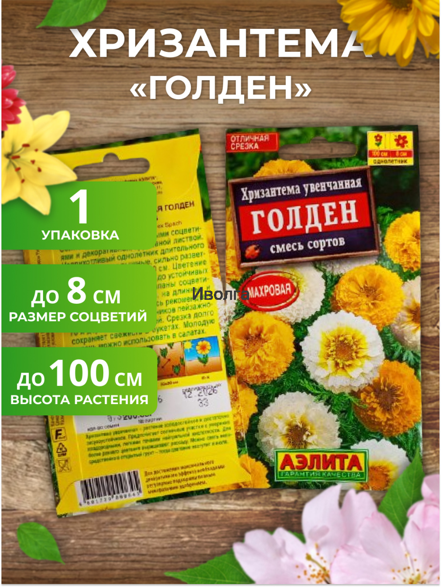 Хризантема увенчанная "Голден" смесь сортов - солнечная смесь с махровыми соцветиями и декоративной, кружевной листвой. Неприхотливый однолетник длительного цветения. Кусты пышные, сильно разветвленные, высотой 90-100 см. Цветение обильное. С начала лета и до устойчивых заморозков растения усыпаны соцветиями-корзинками диаметром 6-8 см, на длинных и прочных цветоносах. Смесь рекомендуется для оформления цветников пейзажного и деревенского стилей. Срезка долго сохраняет свежесть в букетах