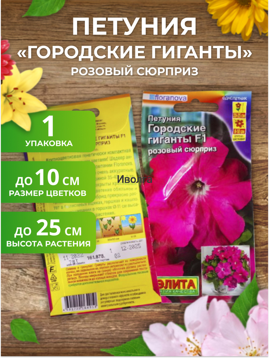 Петуния "Городские гиганты F1" розовый сюрприз - крупноцветковая генетически компактная петуния с огромными цветами! Шедевр английской селекции от компании Floranova. Растения компактные и очень аккуратные, высотой 20-25 см и шириной 35-40 см, в течение всего сезона покрыты красивыми цветами, ? 8-10 см! Цветение обильное и продолжительное. Гибрид прекрасно растет в балконных ящиках, горшках и кашпо.